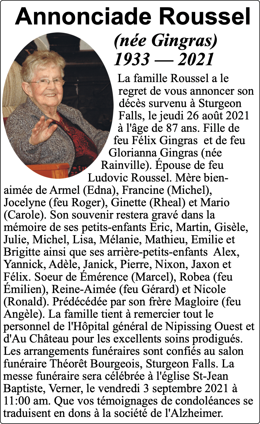 Avis de décès Annonciade Roussel By Tribune Staff - September 2, 2021 0 Share this: Share on X (Opens in new window) X Share on Facebook (Opens in new window) Facebook More Share on LinkedIn (Opens in new window) LinkedIn Share on Reddit (Opens in new window) Reddit Share on Pinterest (Opens in new window) Pinterest